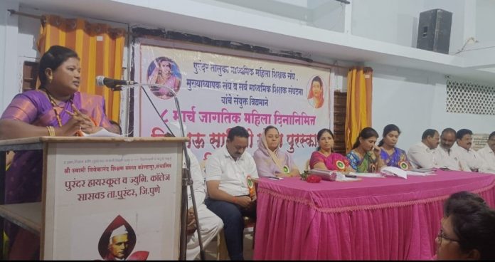 पुरंदर : ( आशोक कुंभार )भारजागतिक महिला दिनानिमित्त पुरंदर हायस्कूल, सासवड या ठिकाणी पुरंदर तालुका माध्यमिक महिला शिक्षक संघ व तालुक्यातील सर्व मुख्याध्यापक , शिक्षक संघांच्या संयुक्त विद्यमाने जिजाऊ – सावित्री गौरव पुरस्कार 2023 वितरण सोहळा उत्साही वातावरणात संपन्न झाला . तालुक्यातील सत्कारार्थी , त्यांचे नातेवाईक , सहकारी , हितचिंतक, तालुक्यातील सर्व मुख्याध्यापक, शिक्षक, सेवानिवृत्त शिक्षक, शिक्षकेत्तर संघांचे अध्यक्ष, सचिव, पदाधिकारी सोहळ्यासाठी उपस्थित राहिले , त्याबद्दल पुरंदर तालुका माध्यमिक महिला शिक्षक संघाच्या वतीने आपले