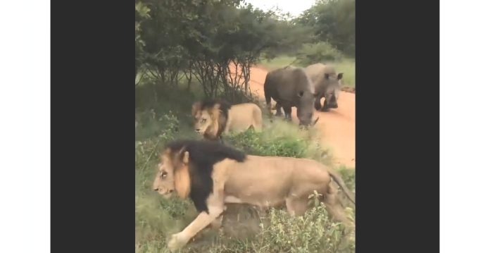 VIDEO:सिंह बसून आराम करत होते, फिरत-फिरत दोन गेंडे आले पुढे काय झाले?