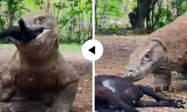 अलिकडेच सोशल मीडियावर एक हृदयद्रावक व्हिडिओ खूप व्हायरल होत आहे. ज्यामध्ये कोमोडो ड्रॅगनने एका बकरीला जिवंत गिळल्याचे दिसून येते. आम्ही तुम्हाला सांगतो की, कोमोडस ड्रॅगनला जगातील सर्वात मोठा सरडा आहे. व्हिडिओमध्ये तुम्हाला एक बकरी जमिनीवर पडलेली दिसते. कदाचित ती बकरी आधीच मेली असेल. मेलेल्या बकरीला पाहून, एक महाकाय कोमोडो ड्रॅगन हळूहळू बकरीकडे सरकतो आणि त्याला आपला शिकार बनवतो. अवघ्या काही सेकंदातच कोमोडो ड्रॅगन, संपूर्ण बकरीला गिळंकृत करतो. हे दृश्य इतके धोकादायक वाटते की ते पाहून लोकांना कापरा भरला. याचा व्हिडिओ सध्या मोठ्या प्रमाणात व्हायरल होत आहे तर युजर्सद्वारे याला शेअरही केले जात आहे.