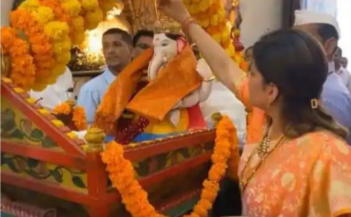 डॉ. प्रणती रोहित टिळक यांनी गणरायाचे औक्षण केले. त्यानंतर ‘श्रीं’ची गणेश मंदिरात प्रतिष्ठापना करण्यात आली. डॉ. रोहित टिळक, डॉ. प्रणती टिळक यांच्या हस्ते श्रींची आरती करण्यात आली. टिळक वाड्यातील गणेश मंदिरात प्रतिष्ठापनेच्या वेळी कौस्तूभ खळीकर यांनी पौरोहित्य केले (Pune Kesari Ganeshotsav)सनई वादनाने टिळक वाड्यातील वातावरण मंगलमय झाले होते. बिडवे बंधूंच्या सनई-चौघड्याचे वादन आणि श्रींच्या मंदिरावरील रंगबेरंगी पुष्पांची सजावटीने वातावरण प्रसन्न व मंगलमय झाले होते.